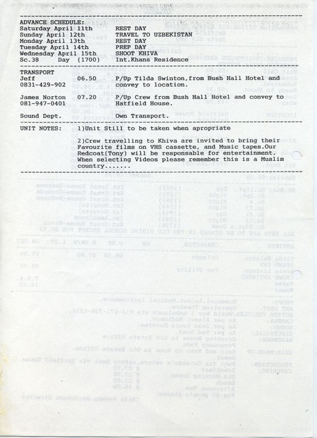 Description Orlando call sheet 43, reverse, Black and white A4 computer printed, Paper