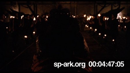 Description Extreme close up of back of Queen Elizabeth leading procession towards Great House, walking away from camera.