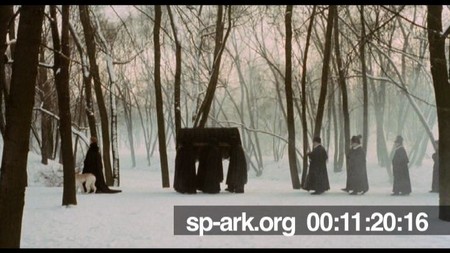Description Establishing tracking shot of snowy landscape, Orlando leading a procession of mourners and Queen Elizabeth's coffin.