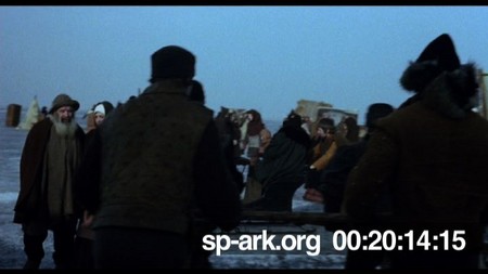 Description point of view shot from sledge moving through local people in the snow and ice.