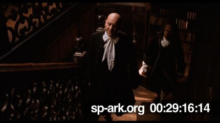 Description high angle shot of staircase in Great House, two men discuss that Orlando has been asleep for six days.