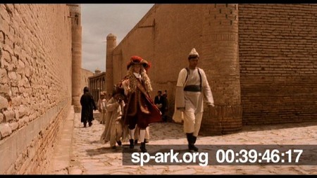 Description Orlando walking through streets of Khiva, following guard surrounded by children.