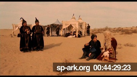 Description long shot of Orlando on his knees, the Khan sitting next to him.
