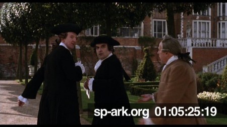 Description Three servants quickly moving away after hearing the Archduke Harry's proposal
