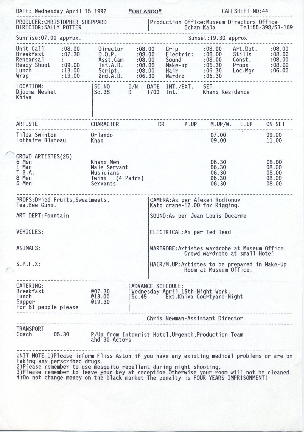 Description Orlando call sheet 44, Black and white A4 computer printed, Paper