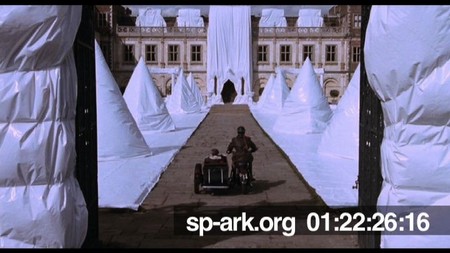 Description Orlando and her daughter on motorbike riding up the path towards the Great House between trees covered in white plastic sheets