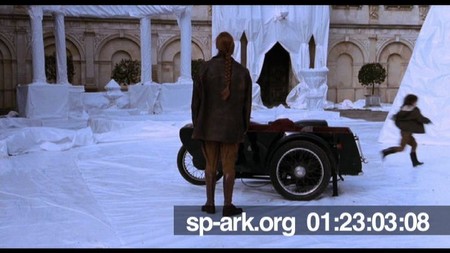 Description Orlando standing and looking at the Great House, her daughter running off screen left
