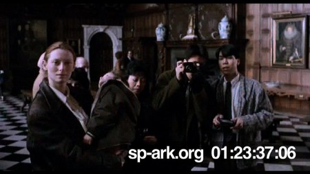 Description Shot as if from behind a painting, Orlando looking to camera, holding daughter on her hip, viewing painting with tourists.