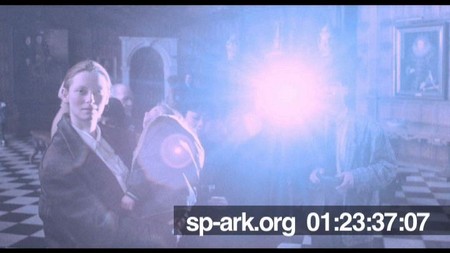 Description Shot as if from behind a painting, Orlando looking to camera,holding daughter on her hip, viewing painting with tourists, tourists taking photograph
