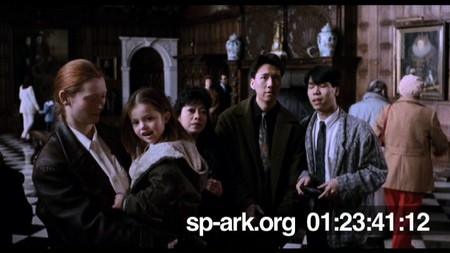 Description Shot as if from behind a painting, Orlando looking to camera,holding daughter on her hip, viewing painting with tourists.