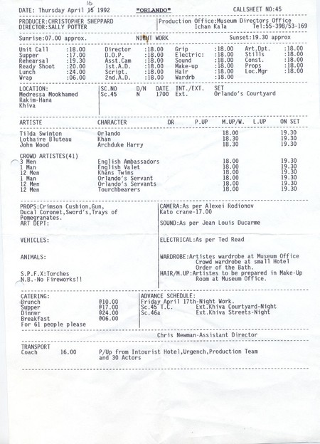 Description Orlando call sheet 45, Black and white A4 computer printed, Paper