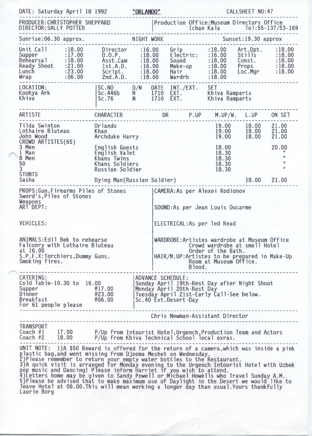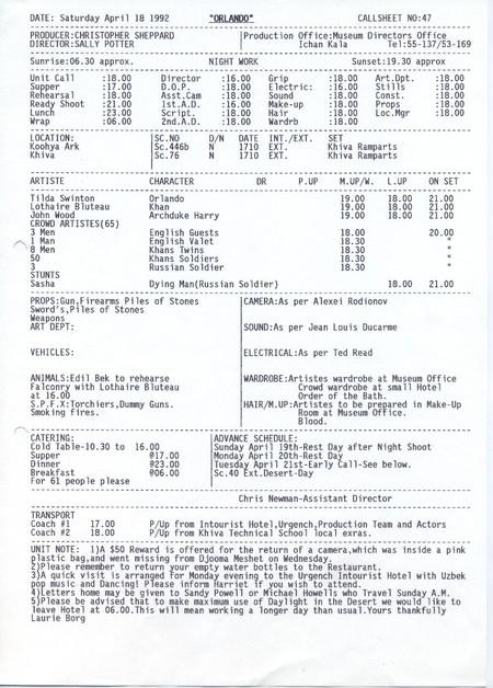 Description Orlando call sheet 47, Black and white A4 computer printed, Paper