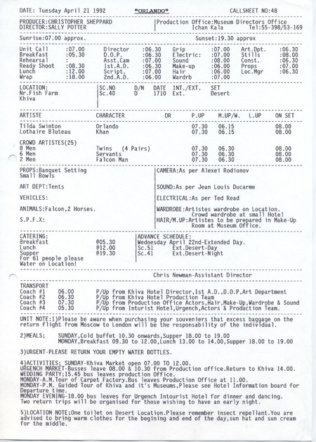 Description Orlando call sheet 48, Black and white A4 computer printed, Paper
