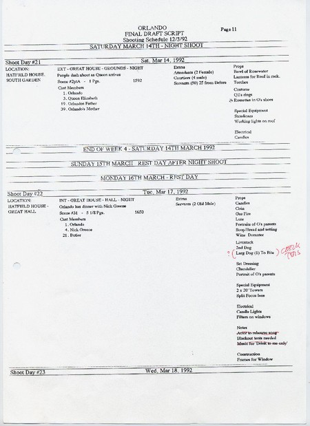 Description A4 computer paper with handwritten notes, with fax cover sheet dated 14.3.92, Paper, Final draft script shooting schedule, Hatfield House