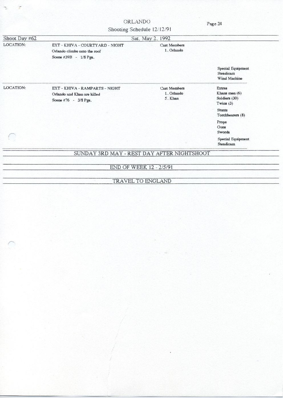 Description Orlando Provisional Shooting Schedule page 24, Black and white A4 computer printed, Paper