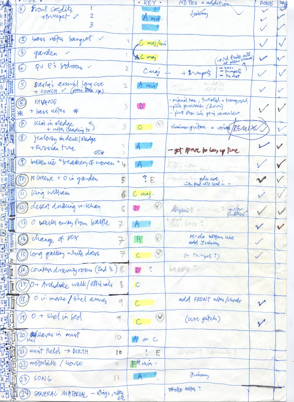 Description Music design overview, Handwritten in blue pen on white paper, Paper