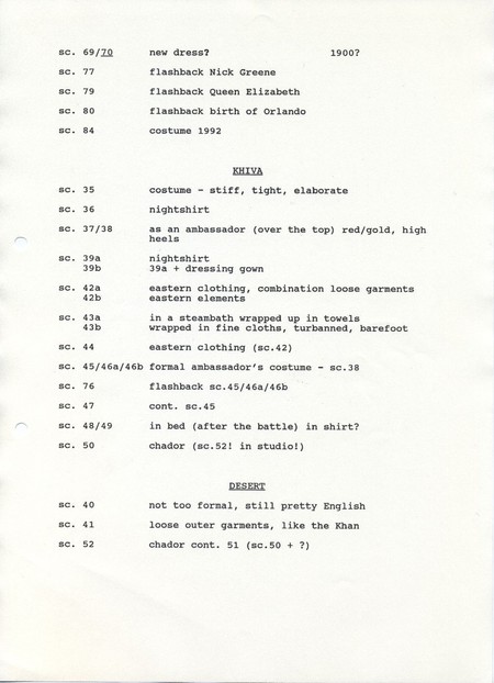 Description Orlando’s Costumes by Location page 2, Black and white A4 computer printed, Paper