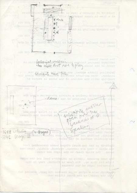 Description Black and white A4 computer printed with handwritten annotations, bound into book, Paper,Orlando Sally Potter’s Shooting Script page 3 back