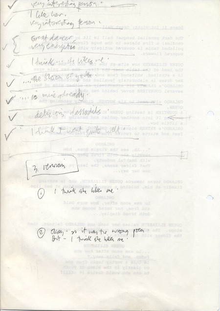 Description Black and white A4 computer printed with handwritten annotations, bound into book, Paper,Orlando Sally Potter’s Shooting Script page 4 back