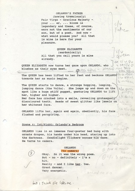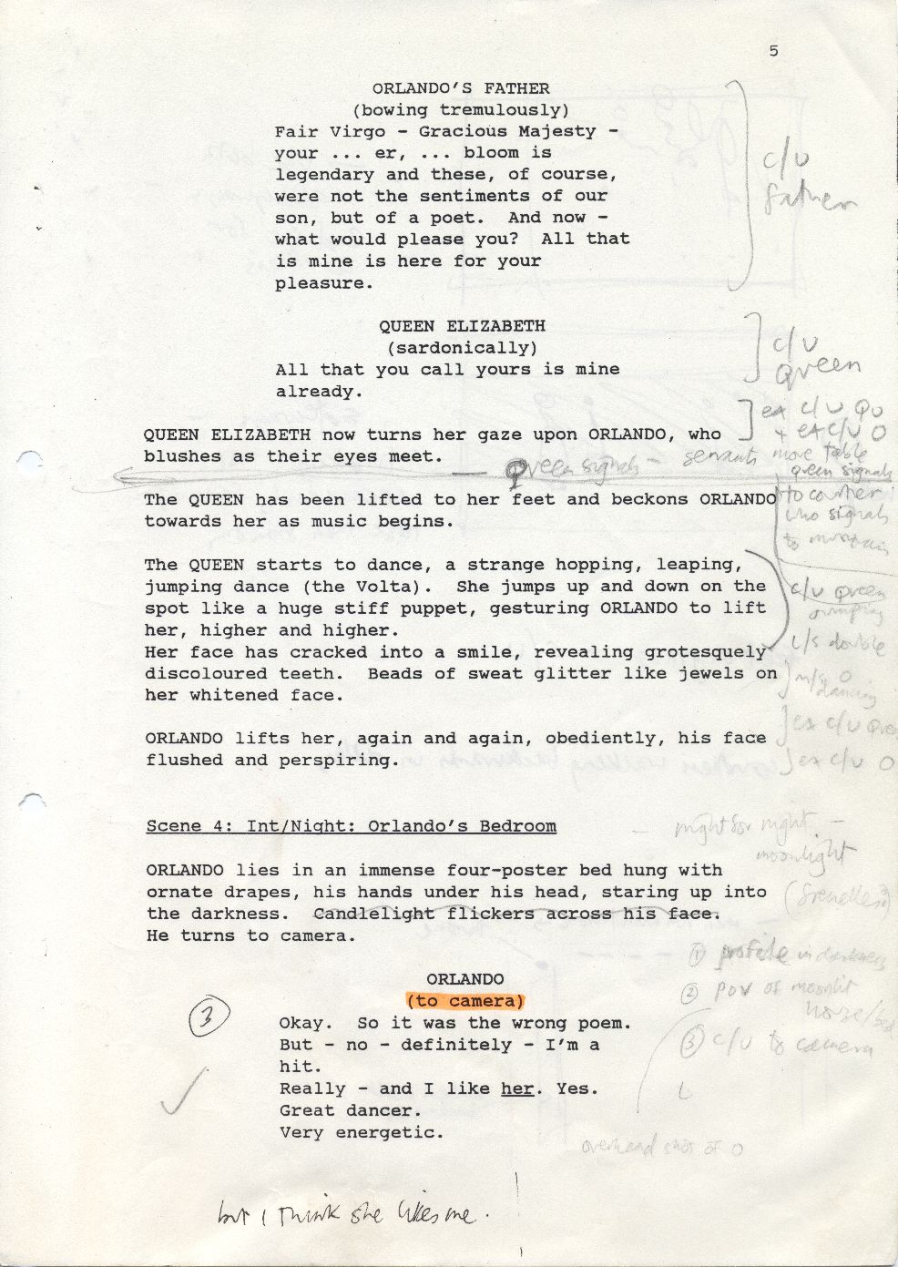 Description Black and white A4 computer printed with handwritten annotations, bound into book, Paper,Orlando Sally Potter’s Shooting Script page 5 front