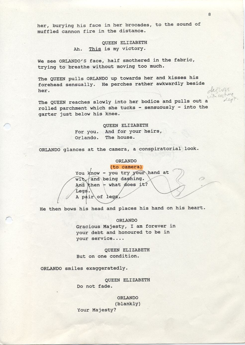 Initially, Sally Potter had the narrative of Orlando living each moment as the present. For instance Orlando in 1592, tells the story as if it were 1592; the Orlando in 1700 tells the story as if it were 1700, etc. However, later this changed and bore more resemblance to Virginia Woolf's prose. The film took on the structure of memories, the present being 1992. Therefore, the narrative of the film did not alter with the aging/ developing of character. The narrator of the film is the female mother Orlando, and thereby tone and language differs from the language of a young boy. In the part of "Death" we can see many differences between Potter's shooting script and the finalized version in her process of adapting Virginia Woolf's novel "Orlando".