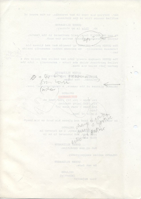 Description Black and white A4 computer printed with handwritten annotations, bound into book, Paper,Orlando Sally Potter’s Shooting Script page 8 back