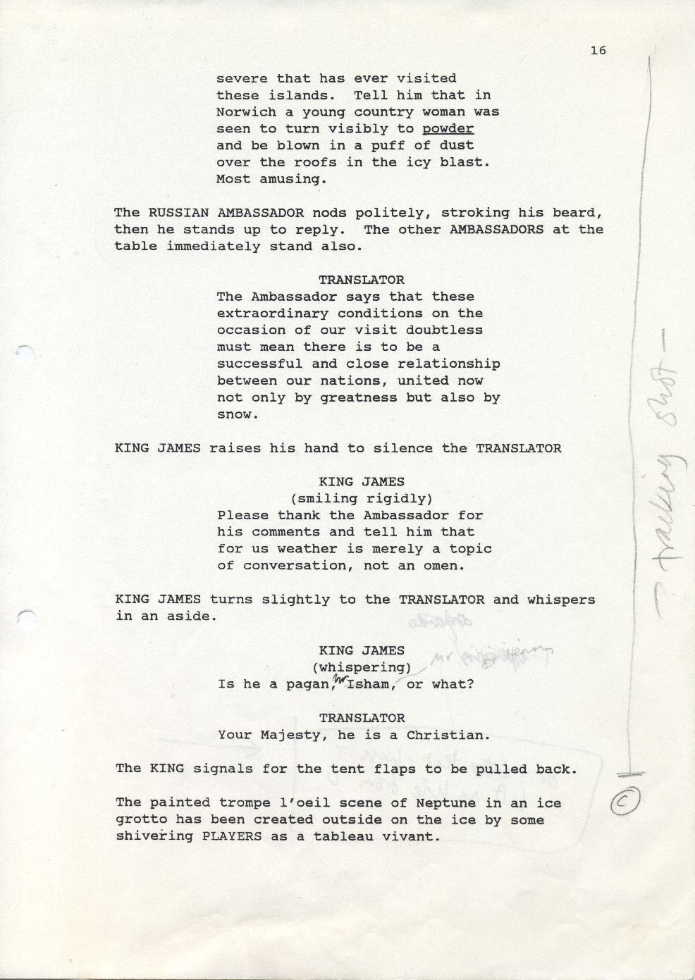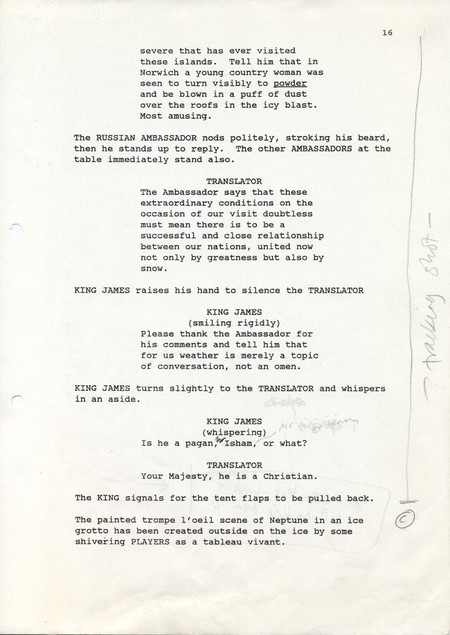 Description Black and white A4 computer printed with handwritten annotations, bound into book, Paper,Orlando Sally Potter’s Shooting Script page 16 front