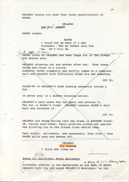 Description Black and white A4 computer printed with handwritten annotations, bound into book, Paper,Orlando Sally Potter’s Shooting Script page 19 front