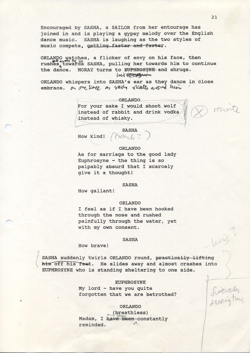 Description Black and white A4 computer printed with handwritten annotations, bound into book, Paper,Orlando Sally Potter’s Shooting Script page 21 front