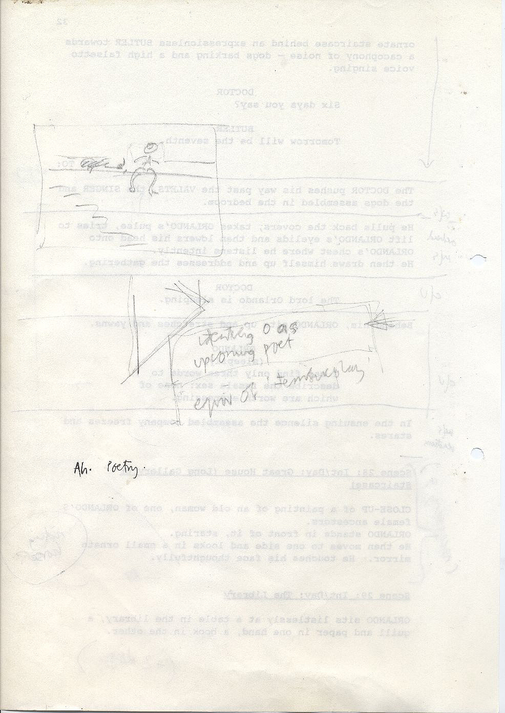 Description Black and white A4 computer printed with handwritten annotations, bound into book, Paper,Orlando Sally Potter’s Shooting Script page 32 back