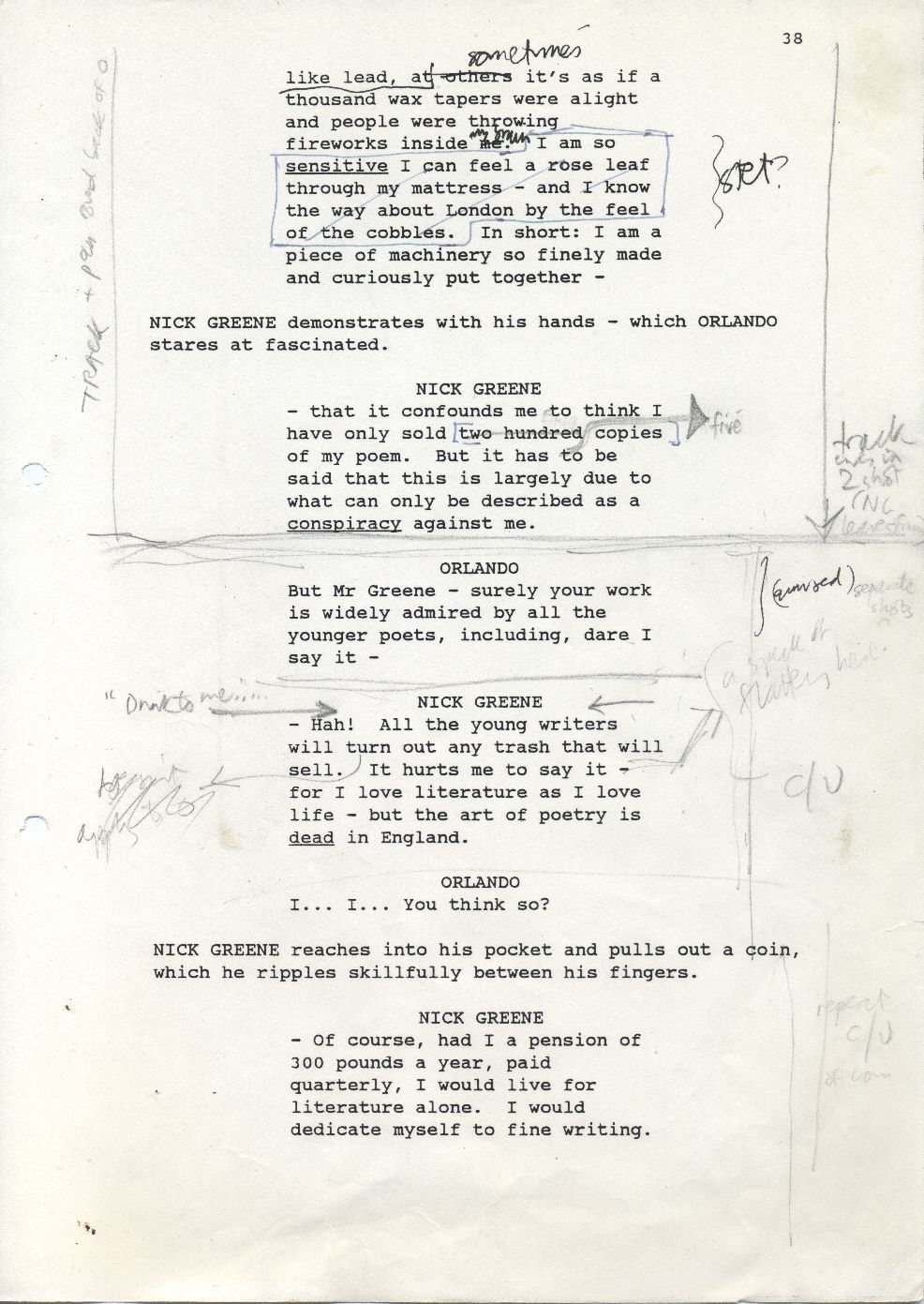 Description Black and white A4 computer printed with handwritten annotations, bound into book, Paper,Orlando Sally Potter’s Shooting Script page 38 front