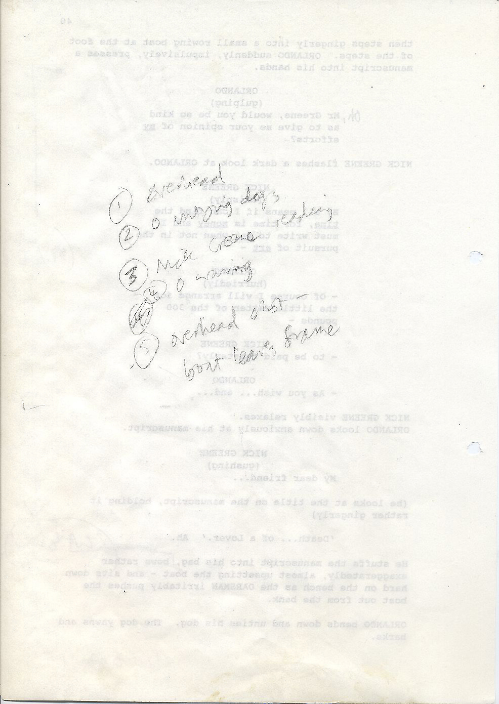 Description Black and white A4 computer printed with handwritten annotations, bound into book, Paper,Orlando Sally Potter’s Shooting Script page 40 back