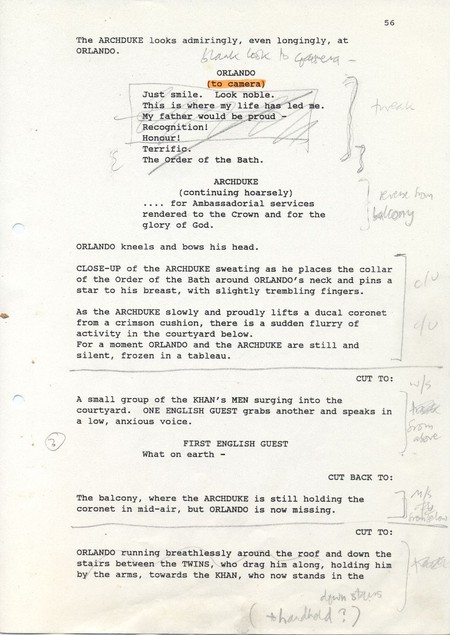 Description Black and white A4 computer printed with handwritten annotations, bound into book, Paper,Orlando Sally Potter’s Shooting Script page 56