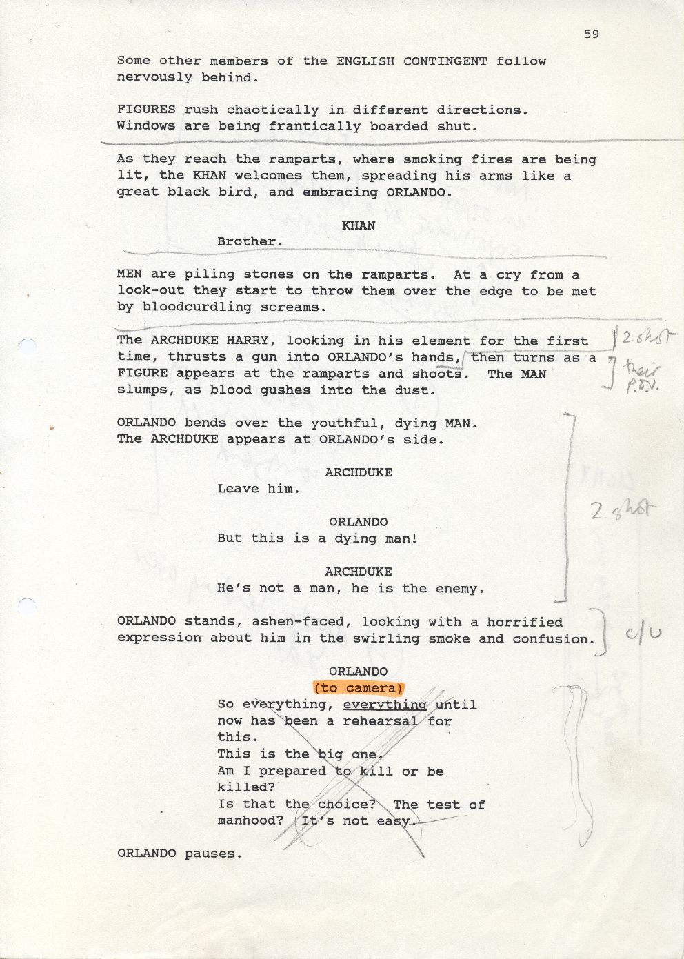 Description Black and white A4 computer printed with handwritten annotations, bound into book, Paper,Orlando Sally Potter’s Shooting Script page 59 front
