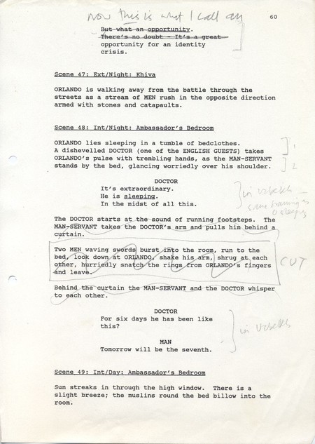 Description Black and white A4 computer printed with handwritten annotations, bound into book, Paper,Orlando Sally Potter’s Shooting Script page 60