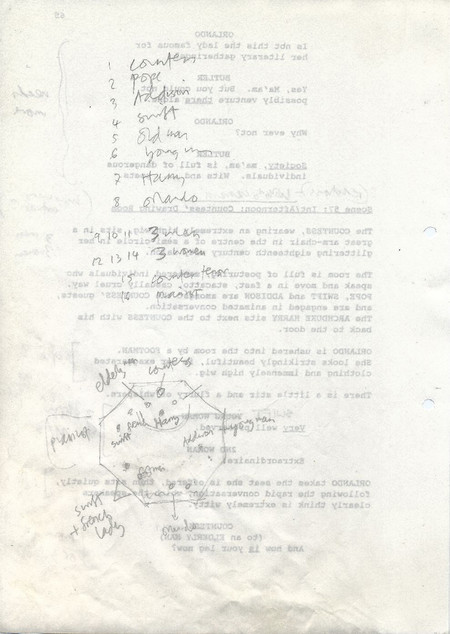Description Black and white A4 computer printed with handwritten annotations, bound into book, Paper, Orlando Sally Potter’s Shooting Script page 65 back