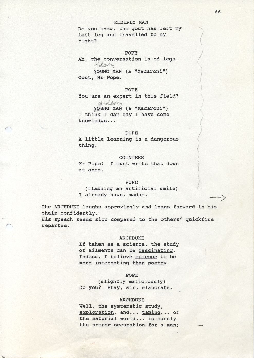 Description Black and white A4 computer printed with handwritten annotations, bound into book, Paper, Orlando Sally Potter’s Shooting Script page 66 front