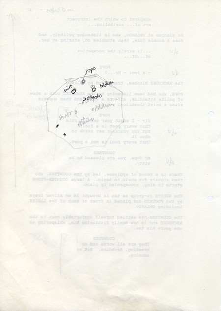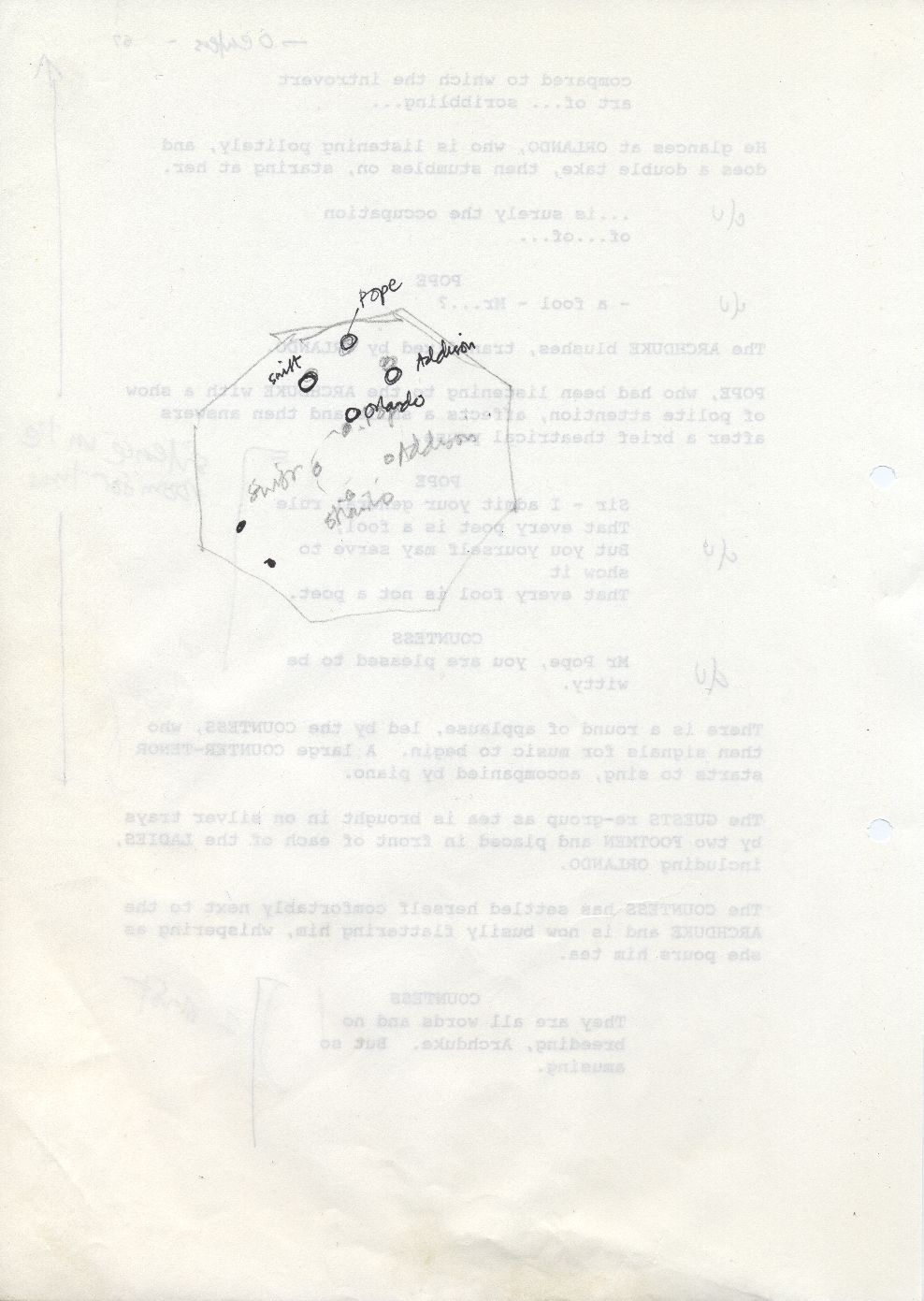 Description Black and white A4 computer printed with handwritten annotations, bound into book, Paper, Orlando Sally Potter’s Shooting Script page 67 back