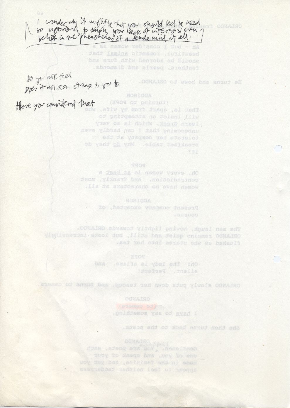 Description Black and white A4 computer printed with handwritten annotations, bound into book, Paper, Orlando Sally Potter’s Shooting Script page 69 back
