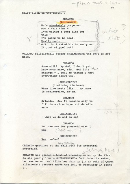 Description Black and white A4 computer printed with handwritten annotations, bound into book, Paper, Orlando Sally Potter’s Shooting Script page 80 front