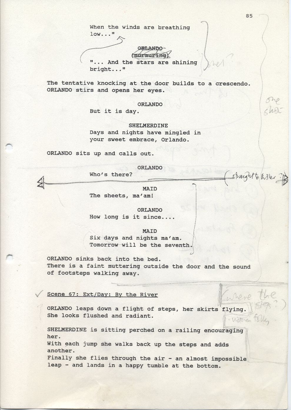 Description Black and white A4 computer printed with handwritten annotations, bound into book, Paper, Orlando Sally Potter’s Shooting Script page 85 front
