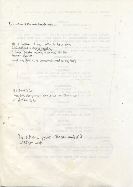 Description Black and white A4 computer printed with handwritten annotations, bound into book, Paper, Orlando Sally Potter’s Shooting Script page 87 back
