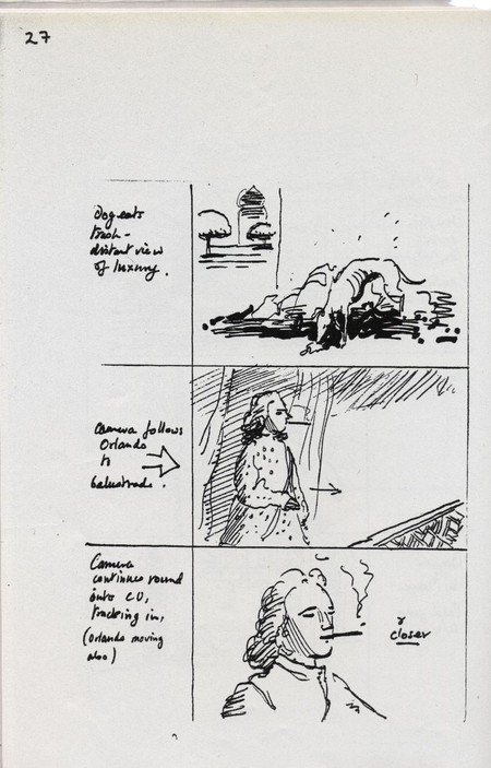 Description Black and white hand-drawn sketches, Paper, Orlando storyboard page 27
