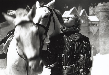 Description 8x10" black and white photograph of Orlando with two white horses, waiting for Sasha