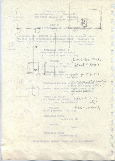 Description Revised draft script for Orlando, handwritten notes and diagrams in pencil, page 7, back