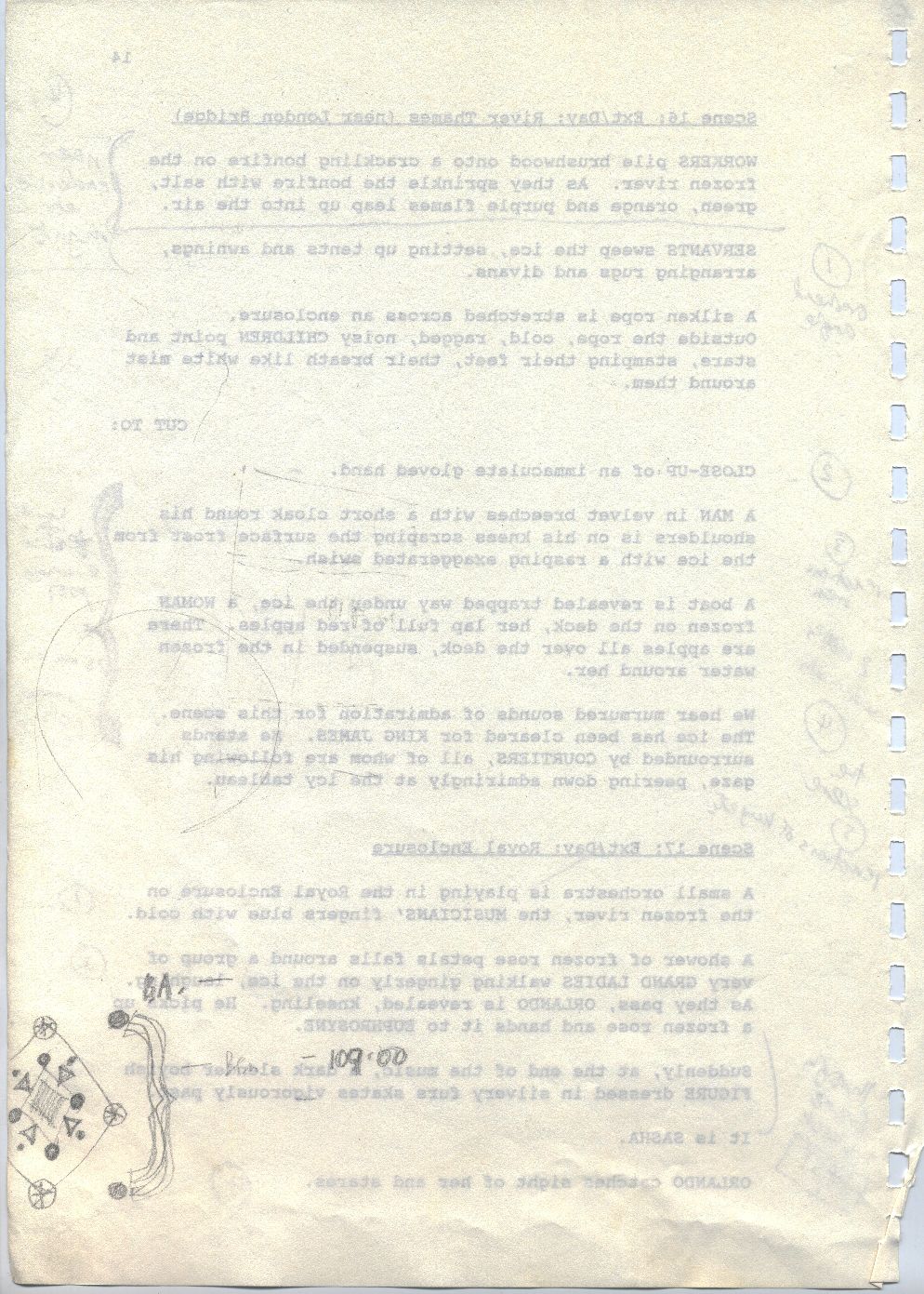 Description Revised draft script for Orlando, handwritten notes and diagrams in pencil, page 14, back
