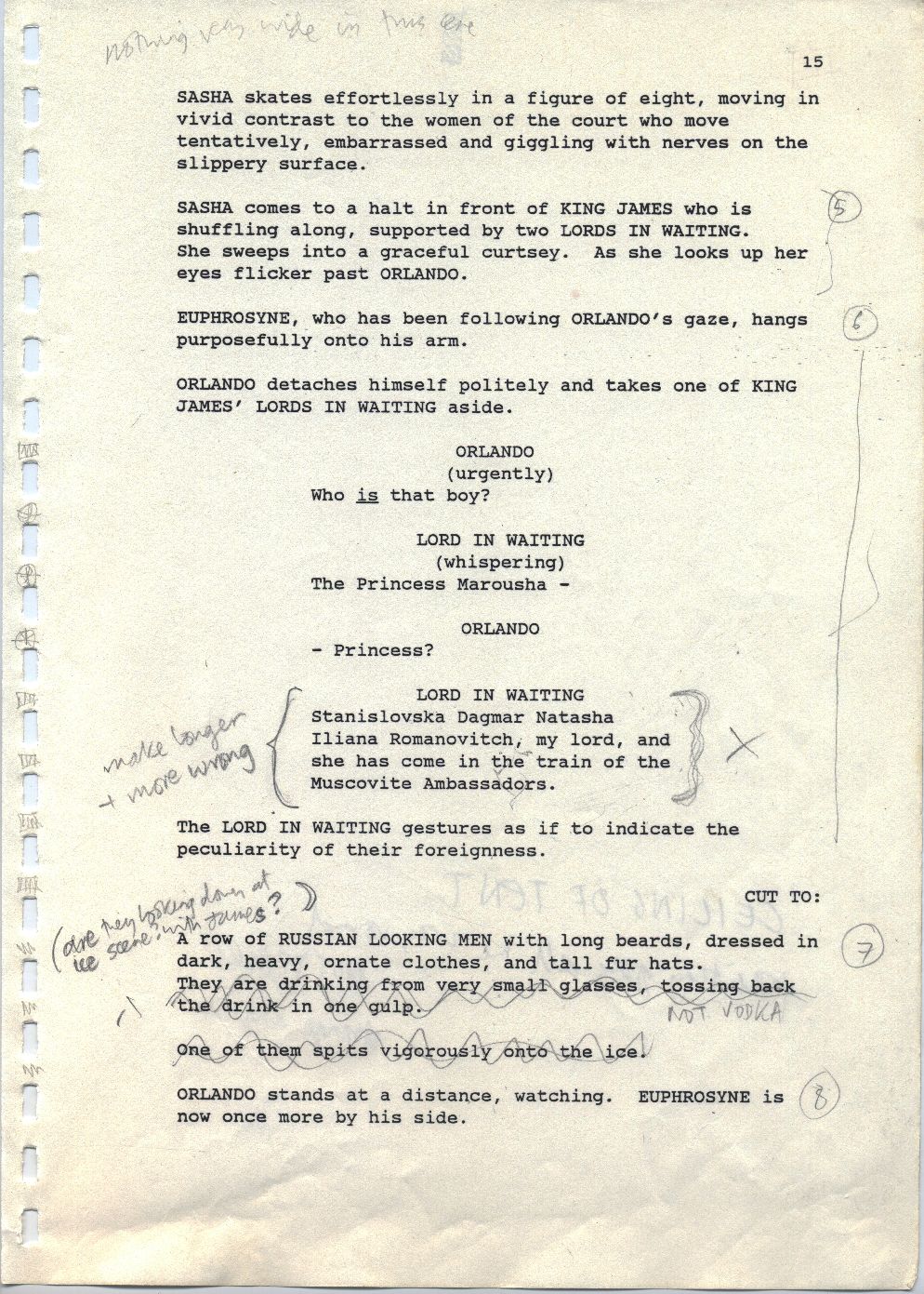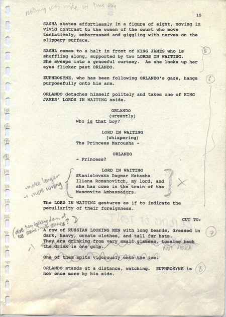 Description Revised draft script for Orlando, black printed text on white A4 paper with annotations in pencil, page 15, front