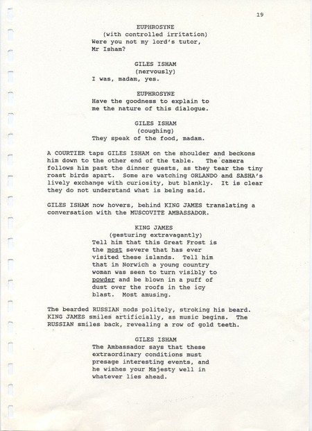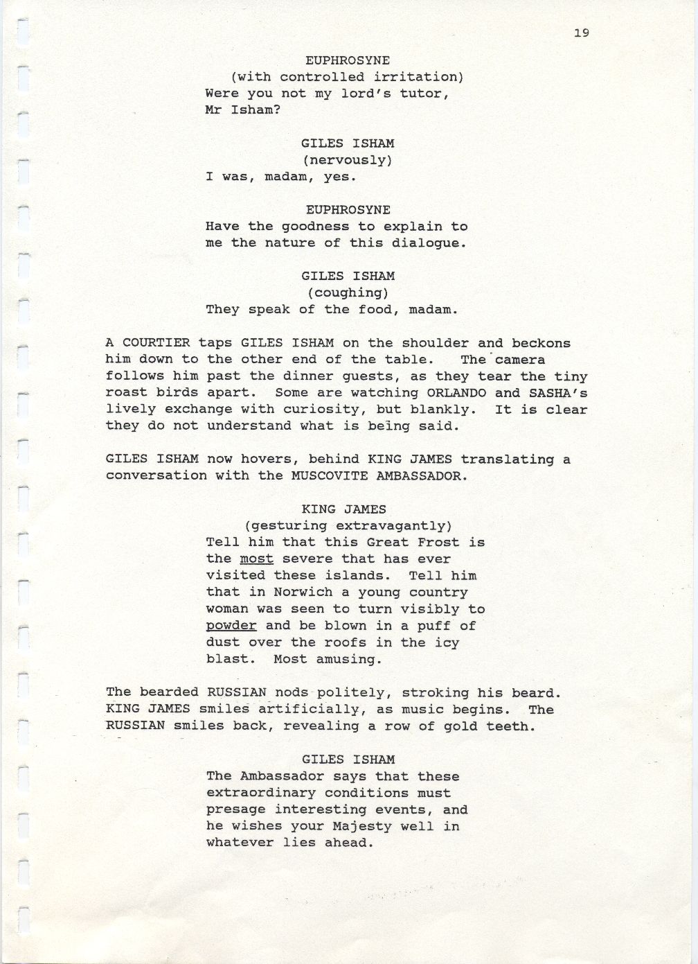 Description Revised draft script for Orlando, black printed text on white A4 paper with annotations in pencil, page 19, front
