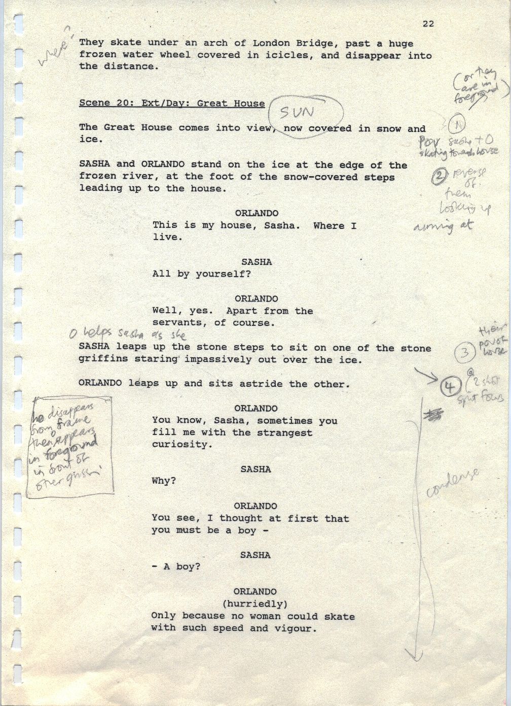 Description Revised draft script for Orlando, black printed text on white A4 paper with annotations in pencil, page 22, front