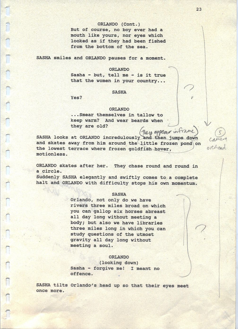 Description Revised draft script for Orlando, black printed text on white A4 paper with annotations in pencil, page 23, front